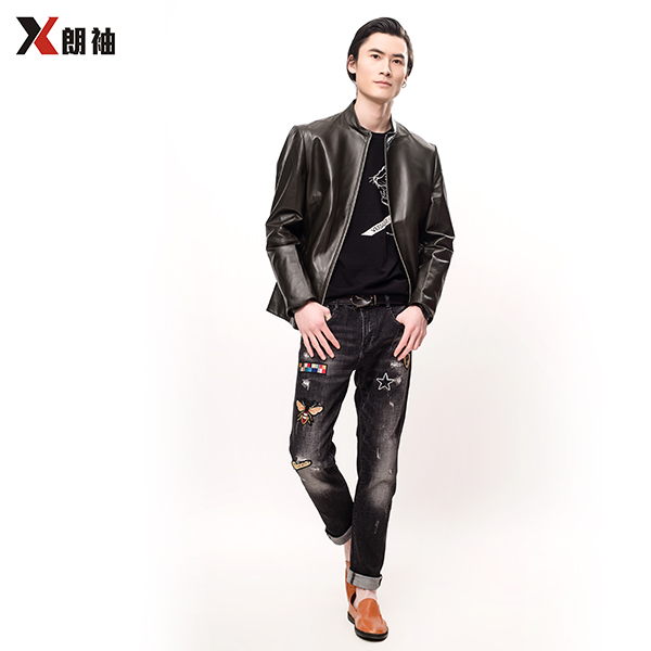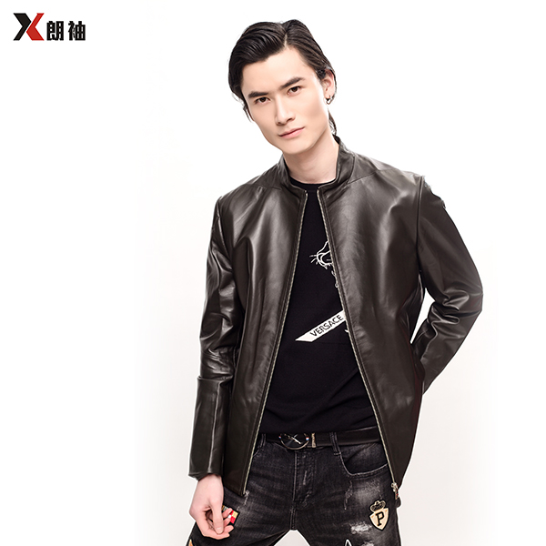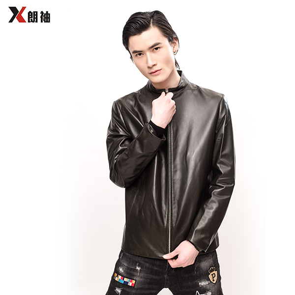 朗袖 男士雅黑立领皮质夹克
